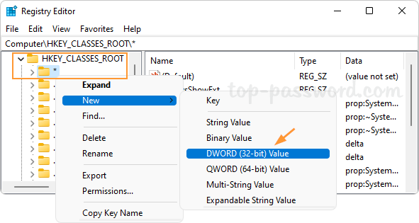 1. Open Registry Editor. In the left pane, expand the HKEY_CLASSES_ROOT key and right-click the * sub-key and select New -> DWORD (32-bit) Value.