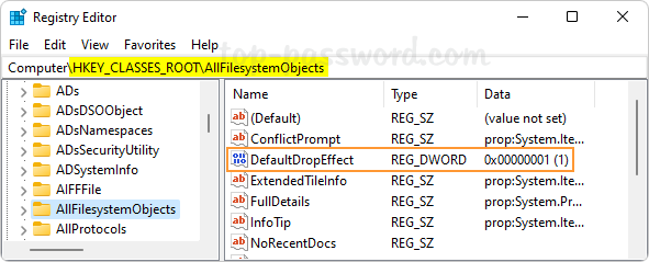4. Next, navigate to another sub-key AllFilesystemObjects and use the same method to create a new 32-bit DWORD value DefaultDropEffect with the same value data.