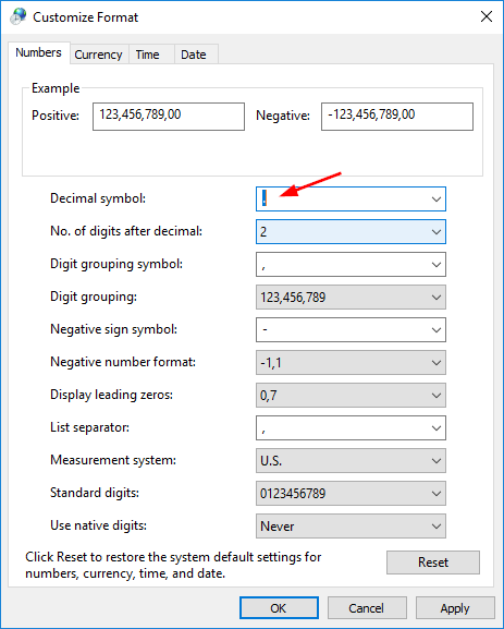- The Customize Format window opens. In the Numbers tab, you can customize how numbers are displayed by Windows. For example, change decimal symbol from , (comma) to . (dot).