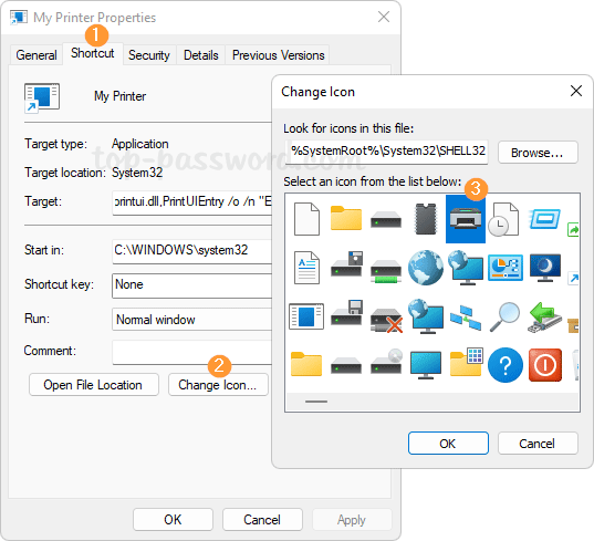 4. Now, you have successfully created a printer shortcut on the desktop. If you want to change the shortcut icon and make it recognizable at a glance, right-click your printer shortcut and select Properties. Click the Change Icon button and choose a printer icon from the SHELL32.dll icon folder.