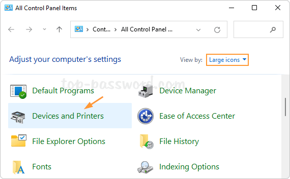 1. Open the Control Panel in Large icons view, and then click the “Devices and Printers” category.