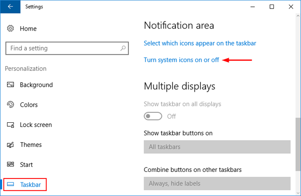 3. Select Taskbar from the left-hand navigation, and then click the link titled “Turn system icons on or off“.