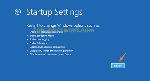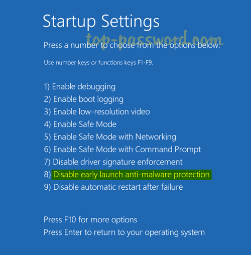 - Your computer should automatically reboot into the Startup Settings menu as shown below. Now, you can press the 8 or F8 key on your keyboard to disable early-launch anti-malware protection.