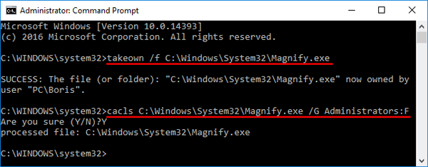 2. Run the following two commands to change the ownership of the Magnify.exe app and grant full permissions to Administrators. Without this step you’re unable to rename or make any change to the Magnify.exe file.