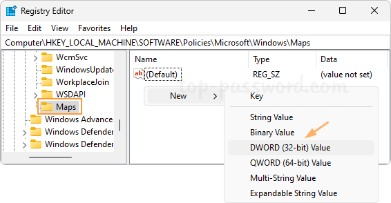 2. Name the new key as Maps, and select it. Next, right-click the blank area in the right pane and choose New -> DWORD (32-bit) Value.