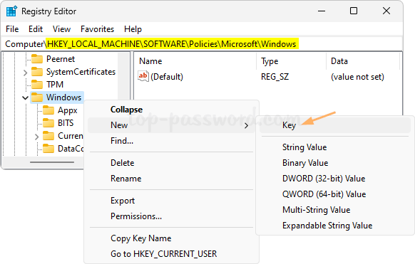 1. Open Registry Editor and browse to: HKEY_LOCAL_MACHINE\SOFTWARE\Policies\Microsoft\Windows. Right-click the Windows key in the left sidebar and choose New -> Key.