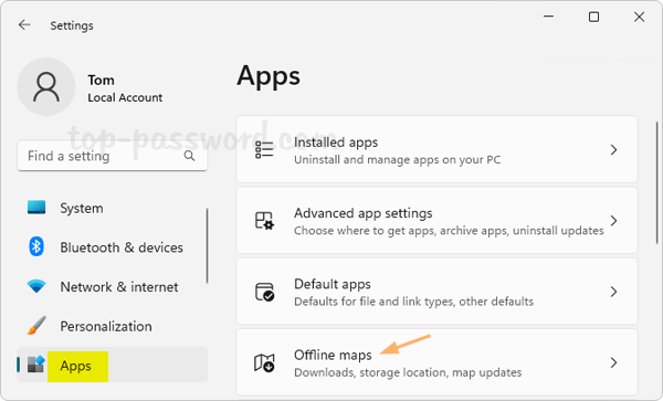 1. Press the Windows key + I to launch the Settings app. Select the Apps category in the left, and then click on Offline maps.