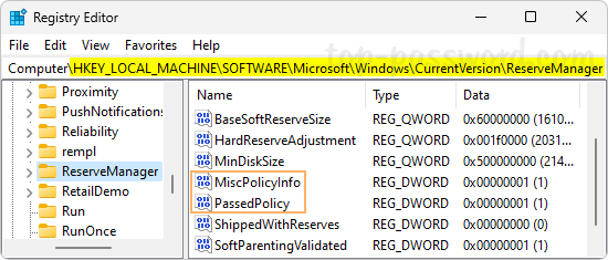 HKEY_LOCAL_MACHINE\SOFTWARE\Microsoft\Windows\CurrentVersion\ReserveManager. Next, we need to change the values for the DWORD MiscPolicyInfo and PassedPolicy on the right-side pane.