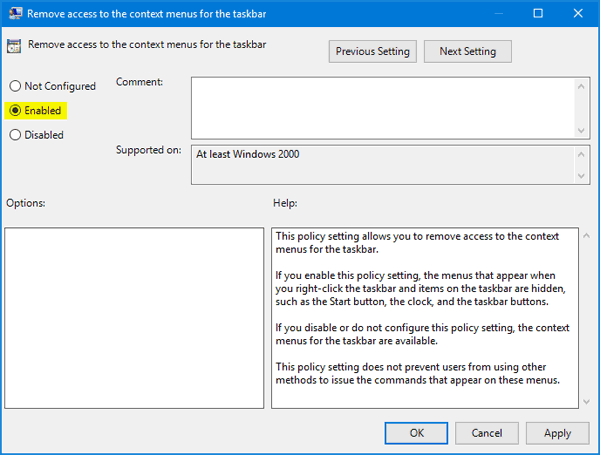Now you have successfully disabled taskbar right-click context menu in Windows 10 / 8 / 7.