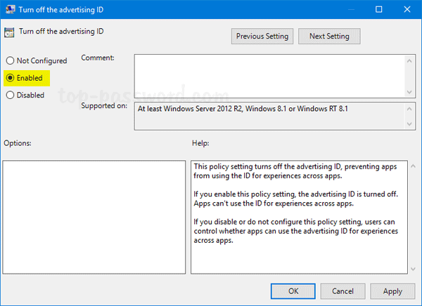 2. Select Enabled. Click Apply and then OK.