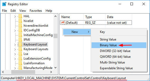 HKEY_LOCAL_ MACHINE\System\CurrentControlSet\Control\Keyboard Layout. In the right-side pane, right-click on the empty space and select New -> Binary Value.