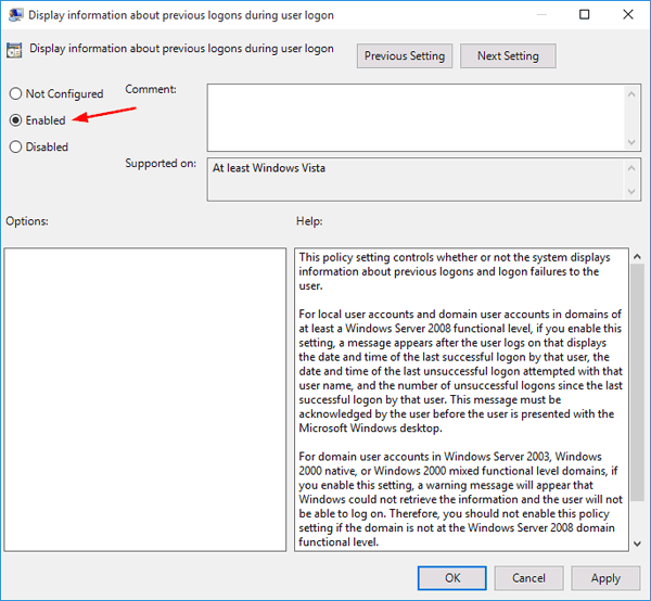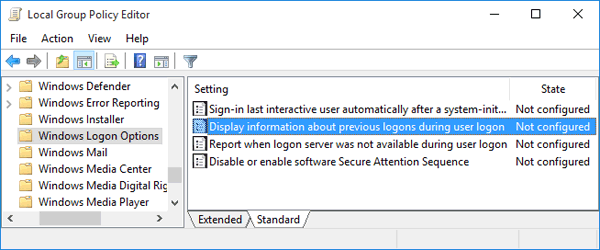 If you have a Windows Home edition, you need to use the following registry hack to enable the “Display information about previous logons during user logon” policy on your computer.