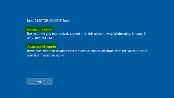 4. The next time you log into Windows, after entering your password, you will see the following screen that shows you the time of last successful logon and unsuccessful logon attempts. Click OK and it takes you to the desktop.