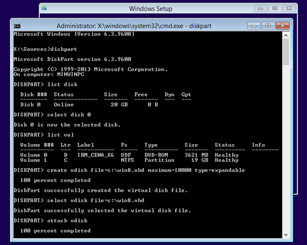 - Now you need to use the diskpart utility to create a virtual drive that Windows 8.1 will be installed on. Type