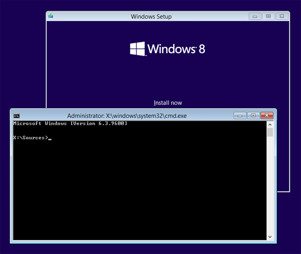 - The next screen allows you to install or repair Windows 8. Press Shift + F10 to open up a Command Prompt.