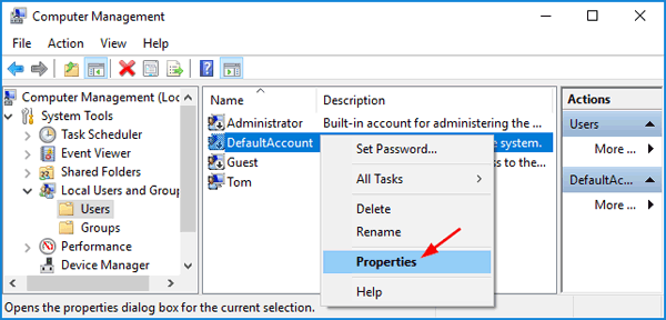 - Expand System Tools -> Local Users and Groups -> Users on the left side. On the right side, right-click on the DefaultAccount and select Properties.
