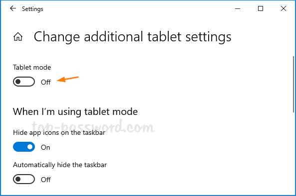 If you need to permanently disable tablet mode, proceed to click the “Change additional tablet settings” link below. In the next window, you can turn off tablet mode completely.