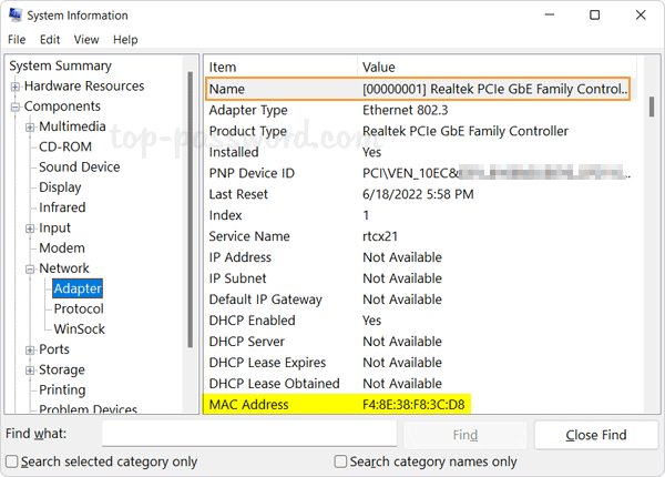 3. From the right side pane, you will see a list of adapters, along with detailed information for each. The Name field can help you quickly identify the adapter you’re looking for, and the MAC address is shown in the “MAC Address” field.