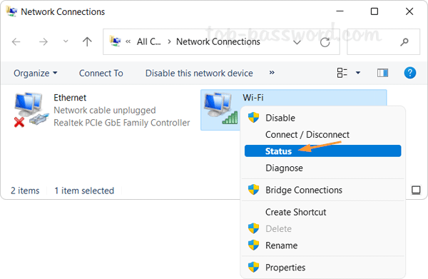 2. Right-click your currently active network adapter and choose Status from the pop-up menu.