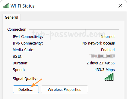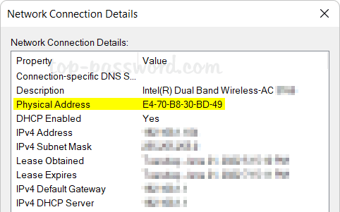 4. In the “Network Connection Details” window, your MAC address is displayed beside the “Physical Address” field.