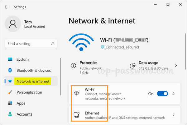 1. Press the WIN + I keys to open the Settings app. Select Network & internet in the left pane. On the right pane, click either Wi-Fi or Ethernet depend on which adapter you’re connected to.