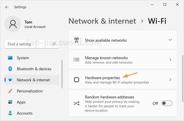 If you’ve clicked Wi-Fi instead, proceed to click the “Hardware properties” option in the next window and you can find the MAC address of your wireless adapter as well.