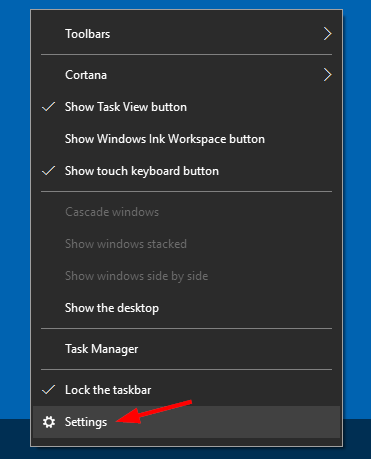Right-click a blank spot on the taskbar, and then click Settings from the context menu.