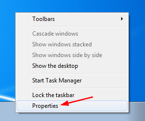 Right-click a blank spot on the taskbar, and then select Properties in the context menu.