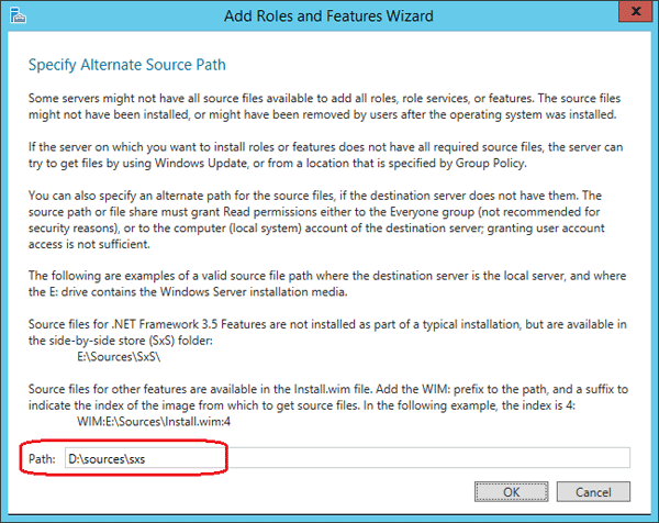 • If your computer has no Internet connection, you have to specify the alternate source path. Click the Specify an alternative source patch link at the bottom of the above screenshot. Then enter path of the source files from Windows Server 2012 installation CD.