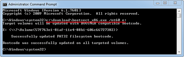 2. Type c:\download\bootsect_x86.exe /nt60 e: and press Enter. Here assume you’ve download and saved the bootsect_x86.exe file to c:\download. You also need to replace e: with the drive letter of your portable hard drive.
