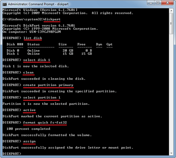 6. Next type the following commands to format the newly created partition and set it as active, hit Enter after each one.