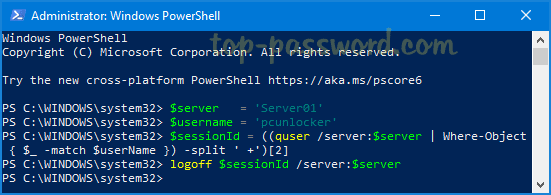 Open Windows PowerShell with administrative rights, and type the following commands. Replace “Server01” with your computer’s name and substitute “pcunlocker” with the name of the account you want to log out.