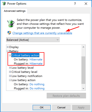 - Expand the Critical battery action, you can select Hibernate, Sleep or Shutdown for both On battery and Plugged in. Expand the Low battery action and you can have the computer do nothing when the low battery level is reached.