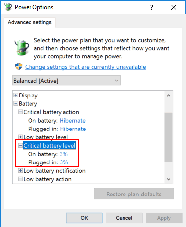 - When it’s done, click OK to save your changes. If you have messed up the settings, just click the Restore plan defaults button at the bottom and your critical & low battery level and action will be restored to default.