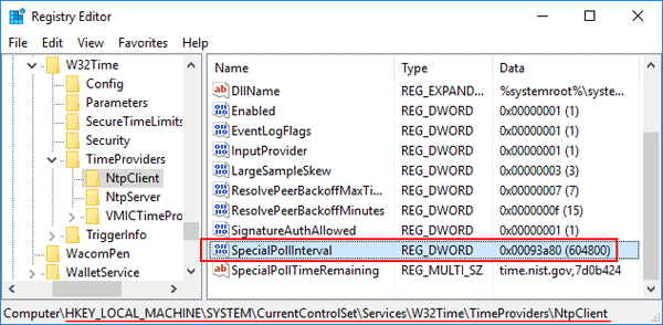 3. Look for the SpecialPollInterval entry in the right pane. This entry specifies the interval in seconds for the Windows Time service to sync the time. The default value on standalone computer is 604800 seconds, that is equal to 7 days.
