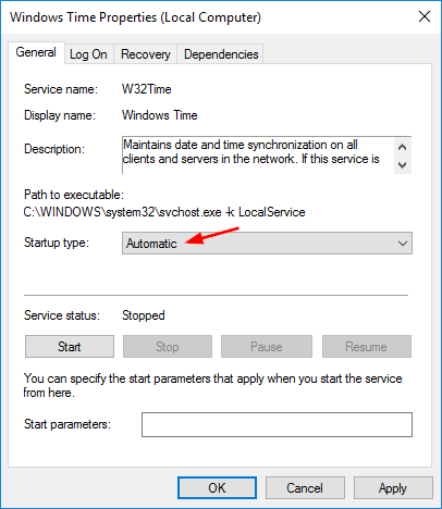 7. Change the Startup type to Automatic and click OK.