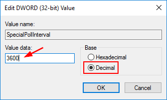 4. Double-click on the SpecialPollInterval entry. From the pop-up dialog, click Decimal and enter the time interval (in seconds). For example, if you want to let Windows sync time each hour, just type 36000. Click OK and close Registry Editor.