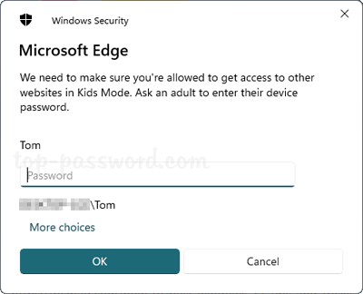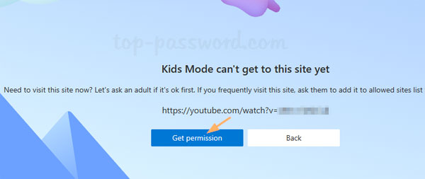 6. If you allow your child to temporarily access a blocked website, click the “Get permission” button and enter your Windows administrator password.