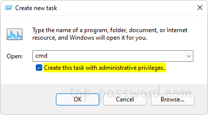 Type cmd in the Open box, tick the “Create this task with administrative privileges” option if you want to open an elevated Command Prompt.