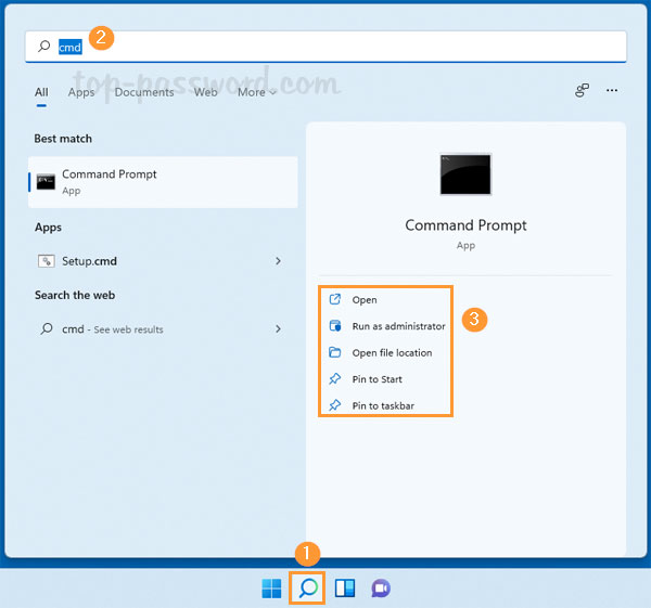 Click the Search button in the taskbar. Type cmd in the search box at the top. The Command Prompt app will appear under Best Match section.