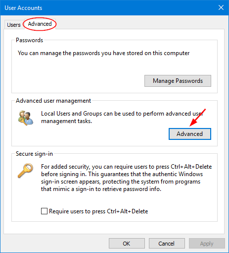 When the User Accounts dialog box opens up, click the Advanced tab and then click the Advanced button. You now have the Local Users and Groups snap-in open.