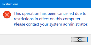 4. If a user tries to delete any printers from your computer, a message will appear saying “This operation has been cancelled due to restrictions in effect on this computer. Please contact your system administrator“.
