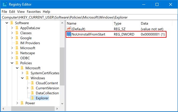 - Right-click the newly-created Explorer key, and then select New -> DWORD (32-bit) Value. Name it NoUninstallFromStart and change its value from 0 to 1.