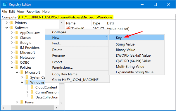 HKEY_CURRENT_USER\Software\Policies\Microsoft\WindowsRight-click the Windows key in the left pane, and then select New -> Key and name it Explorer.