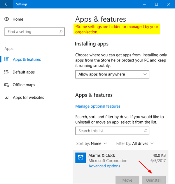 - Reboot your computer for the policy to take effect. When you right-click on an app in the Start menu, you shouldn’t find the uninstall option now. If you dig into the Settings -> Apps & features, then select any app and you’ll see the “Uninstall” option is also grayed out.