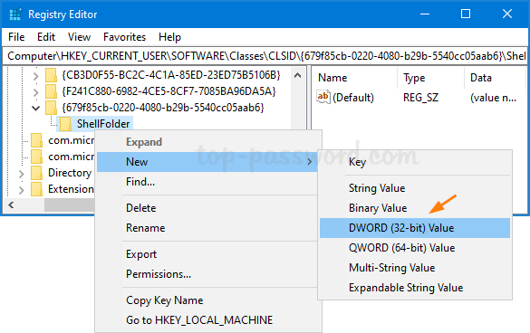 4. Next, right-click on the ShellFolder key in the left pane, and select New -> DWORD (32-bit) Value.