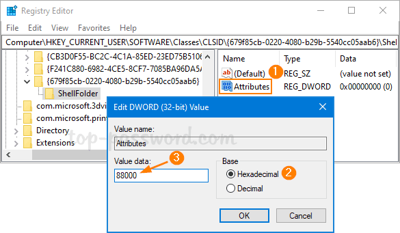 5. Name the new DWORD Attributes and double-click it to modify. In the pop-up dialog box, select the Hexadecimal option and enter 88000 in the Value data box. Click OK.