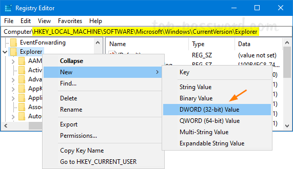 2. In the left-side pane, right-click on the Explorer key and then select New -> DWORD (32-bit) Value.