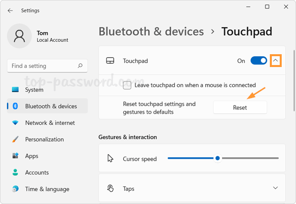 - Open the Settings app by pressing the WIN + I keyboard shortcut. Select Bluetooth & devices on the left side, and then click Touchpad on the right side.