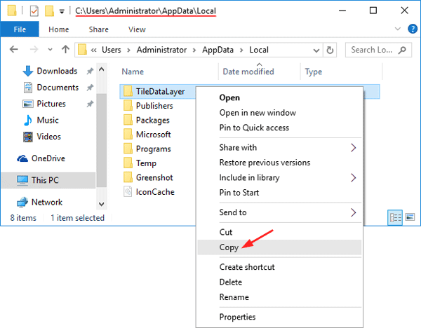 Now log off the new administrator account, and log in with your regular account (In my example, it’s Tom). Browse to the folder: C:\Users\{new_administrator_account}\AppData\Local, and copy the TileDataLayer folder to the root path of C:\ drive for backuping.